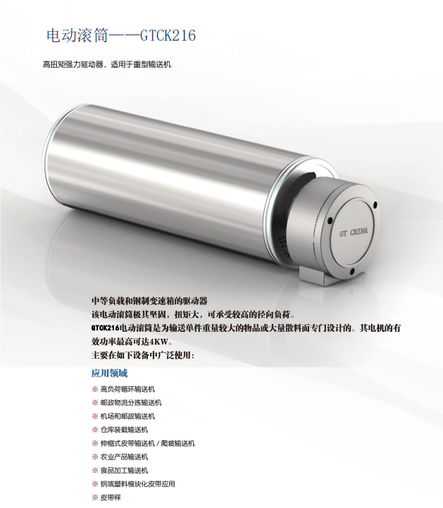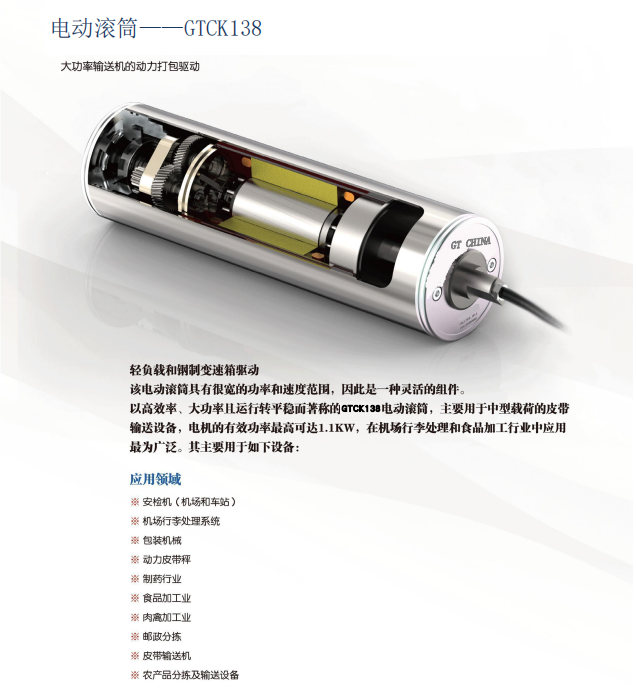 - 有别于传统电机驱动系统(一般由电机、减速机、驱动滚筒、链条和支撑组成),电动滚筒将全部外置部件组装于同一个筒体内,形成一个简捷的驱动单元,从而减小了输送机设备的占用空间。